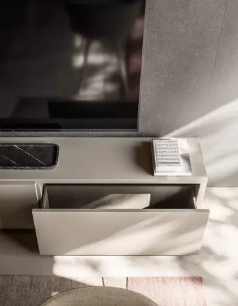 Gli elementi d’arredo sono definiti da tonalità neutre e finiture materiche, che coinvolgono ogni dettaglio: dalle schiene ai ripiani, dai frontali fino agli interni dei cassetti, per un design coerente e armonioso.